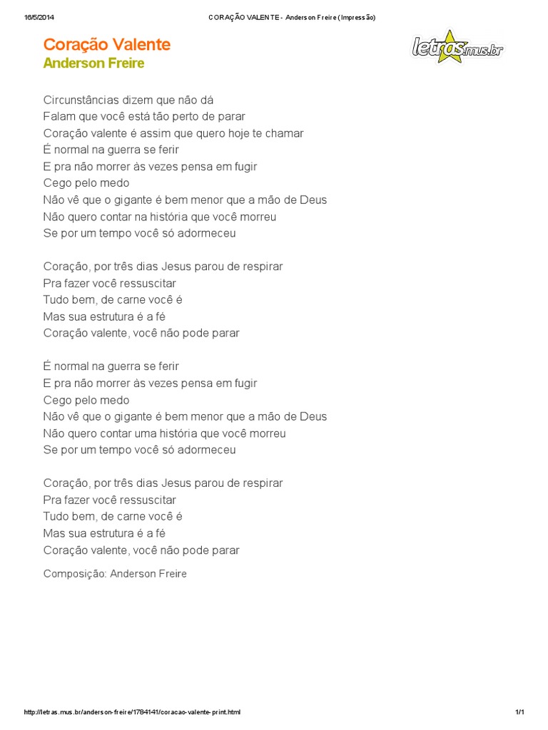 Coração, por três dias jesus parou de respirar / pra fazer você ressuscitar c#m f#m c#m c#7(4/9) circunstâncias dizem que não dá c#m c#m7(9) f#m7(11) falam que você está tão perto de parar b4 coração valente. .anderson freire by projetoaovivo, released 02 august 2012 coração valente anderson freire circunstâncias dizem que não dá falam que você coração por três dias jesus parou de respirar pra fazer você ressuscitar tudo bem de carne você é mas sua estrutura é a fé. Baixar a musica do anderson fere coracao valente : Tudo bem, de carne você é. Baixar a musica do anderson fere coracao valente.